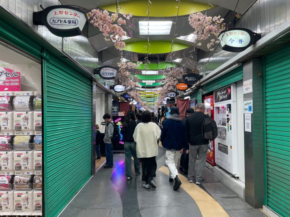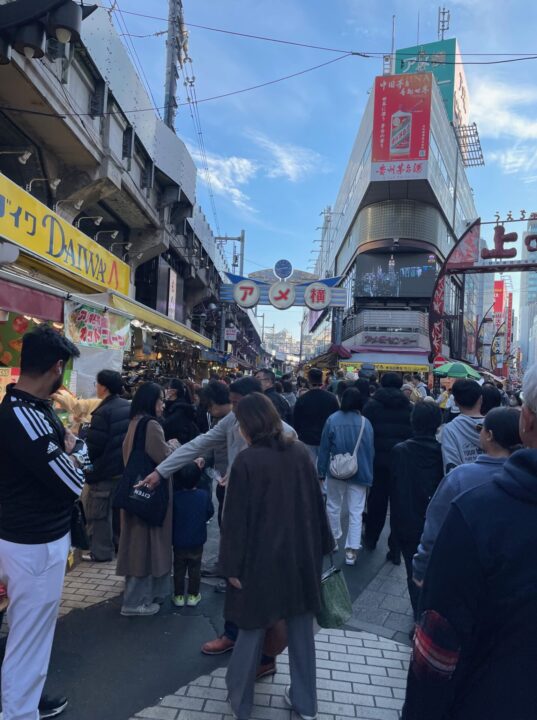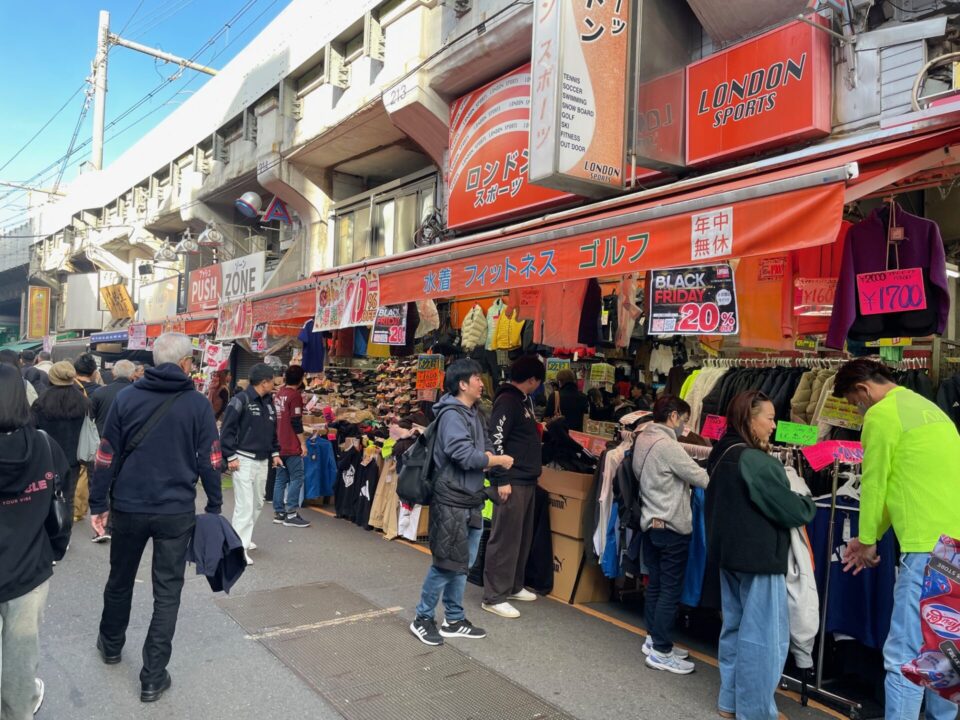 JR上野駅と御徒町の間に位置する500mの道沿いに、400店あまりのお店が軒を連ねています。いつ行ってもとっても賑やか。